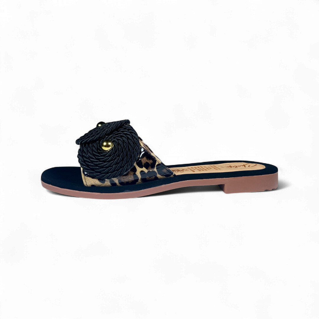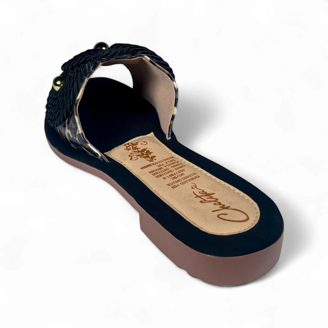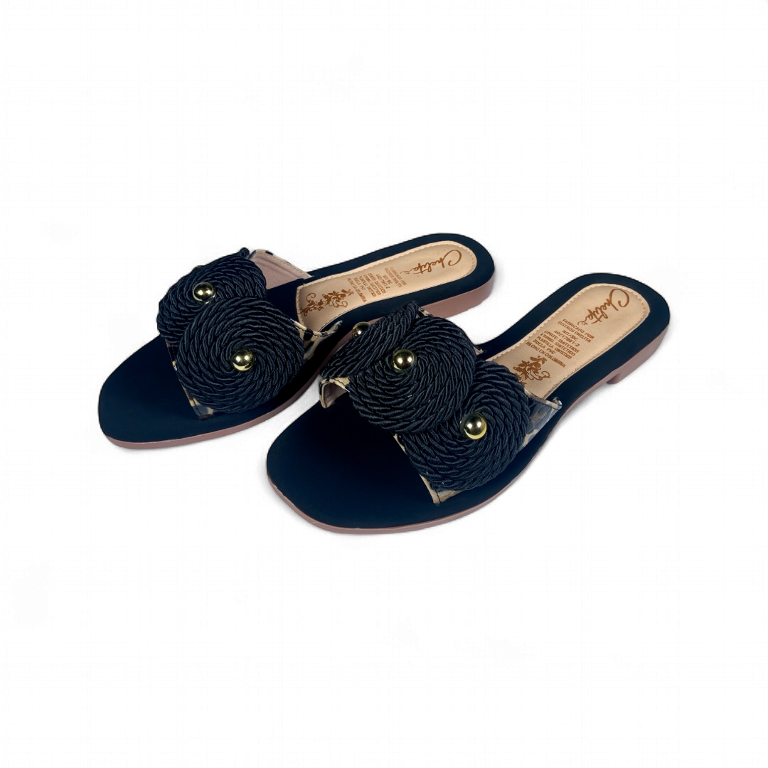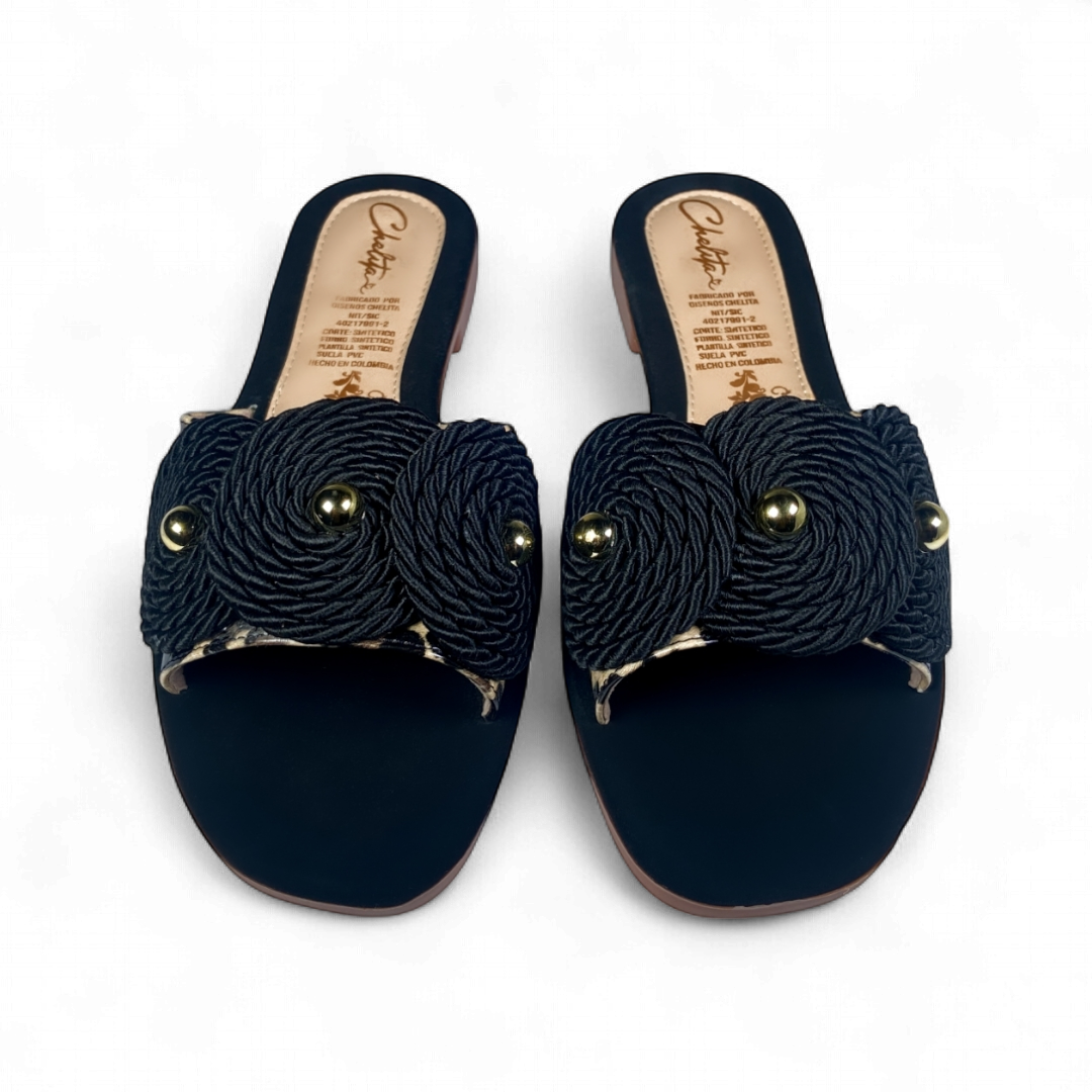 Lleva el arte en tus pies con un toque de misterio elegante. Este zapato es una pieza única que combina la comodidad de una sandalia plana con un diseño dramático y distinguido. Sus dos grandes flores hechas con cuerda trenzada en color negro, y los botones dorados, crean un contraste de lujo sobrio.