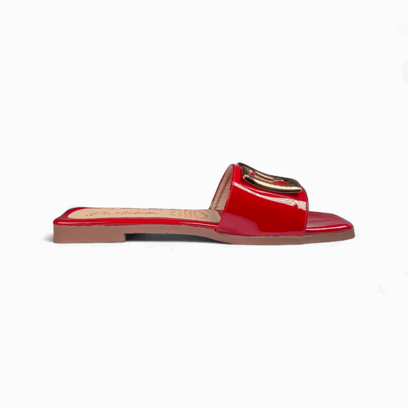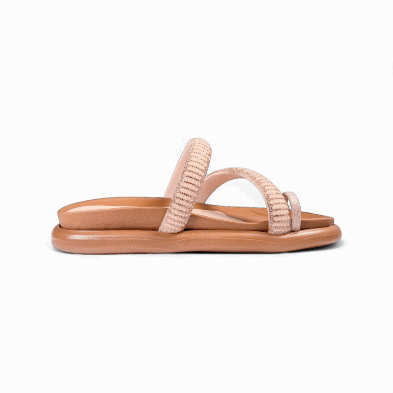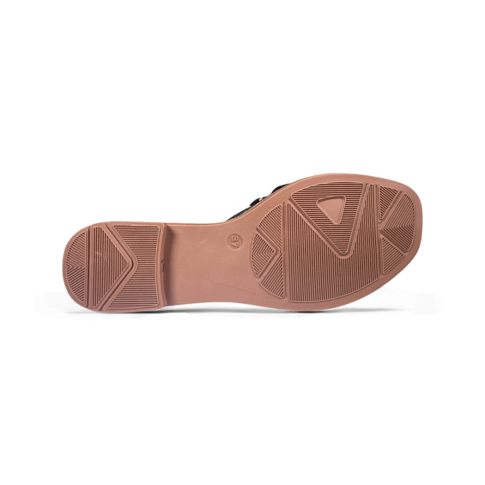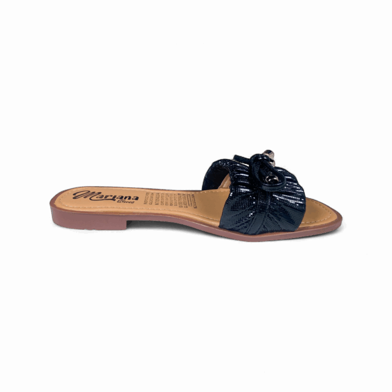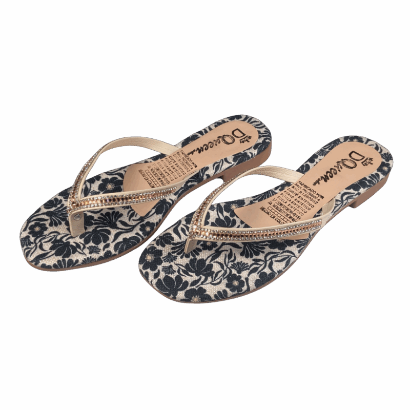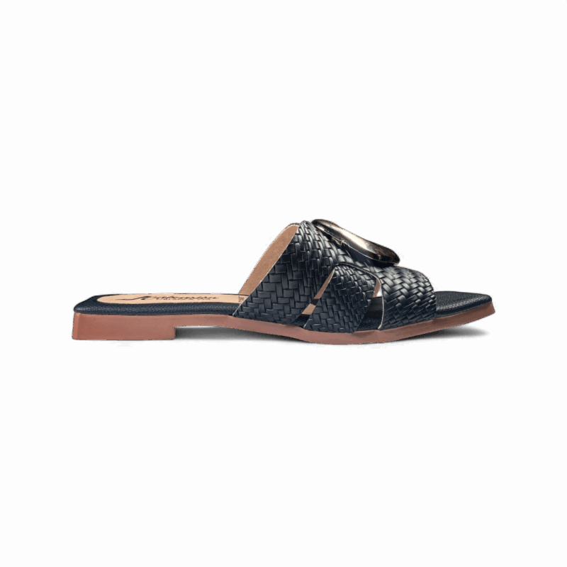 Lleva el arte en tus pies con un toque de misterio elegante. Este zapato es una pieza única que combina la comodidad de una sandalia plana con un diseño dramático y distinguido. Sus dos grandes flores hechas con cuerda trenzada en color negro, y los botones dorados, crean un contraste de lujo sobrio.