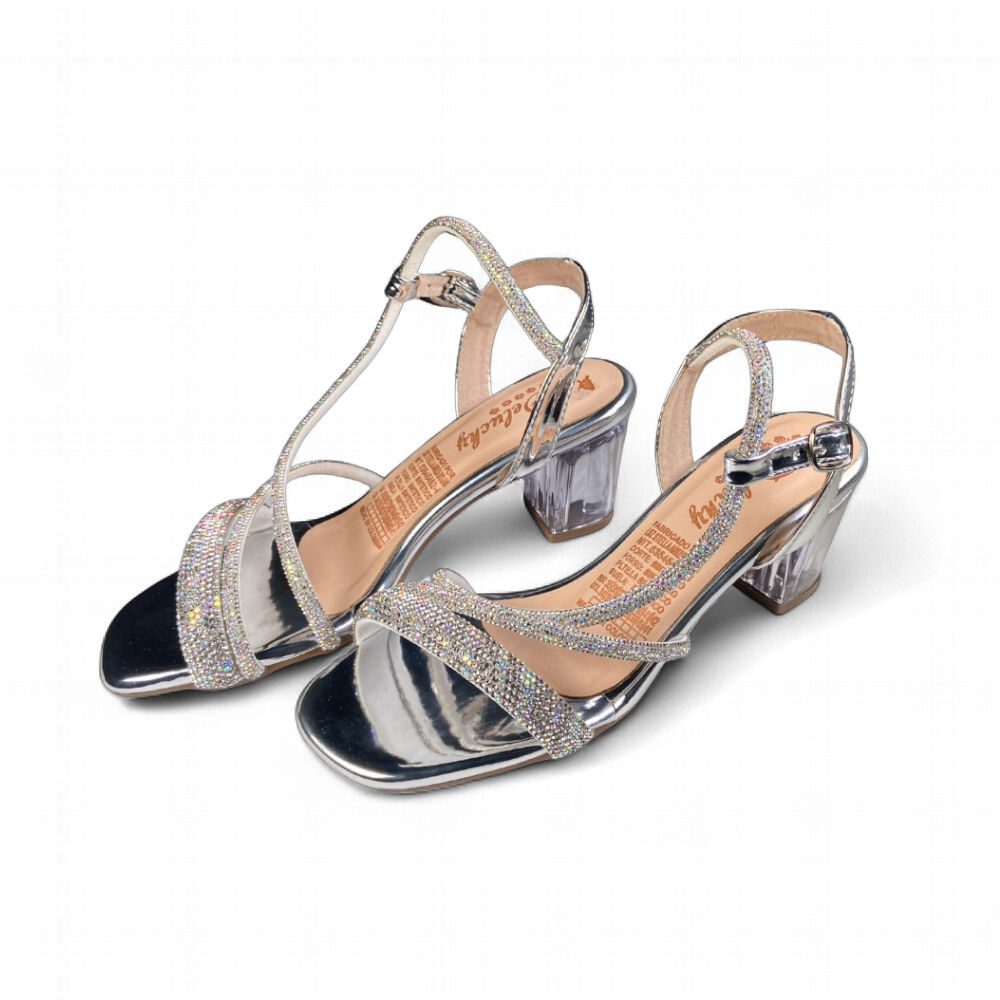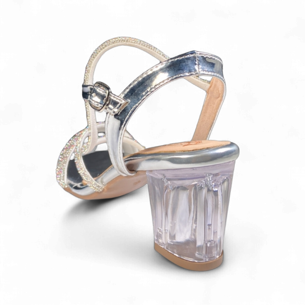 Enfócate en el glamour: el mundo está listo para verte brillar. Este calzado es la pieza central de cualquier atuendo de fiesta. Su diseño en color plateado espejo y las tiras cubiertas de pedrería iridiscente capturan y multiplican la luz, mientras que el tacón de acrílico transparente le añade un toque de modernidad espectacular.